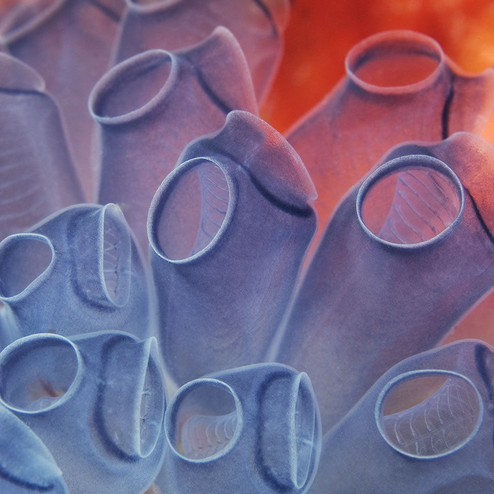 Ascidians are one of the most simple and yet attractive creatures in the worlds oceans. Despite how plant-like they appear, they are actually animals. Commonly called sea squirts, they filter water in vast amounts through their bodies. Looking closely through the lens revealed the incredible filter mechanism inside each separate ascidian. Each individual creature here is approximately 10mm long. The orange background colour is caused by the large sponge they were growing alongside.