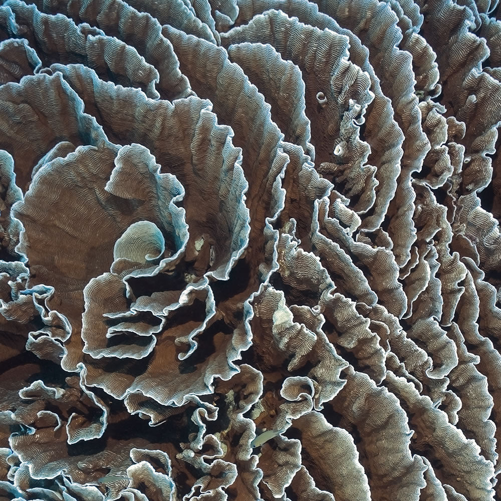 Capricorn coral can cover vast areas of reef and slope. It is made up of natural swirls and spirals. Here I am hovering 1.5m above the coral and looking straight down. The scale of the coral that is shown in the image would be 3m across and this is a mere fragment of the extent of this coral species seen on our dive.