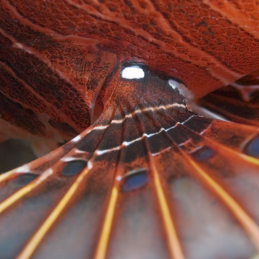 Lionfish of varying colours and shades inhabit much of the tropical waters off the West Australian coast. This subject was so motionless that I was able to get my lens within centimetres of it. It is quite fascinating to have a fish stay completely still while you examine it in fine detail with a macro lens. This image shows the large and beautiful pectoral fin where it attaches to the body of the fish.