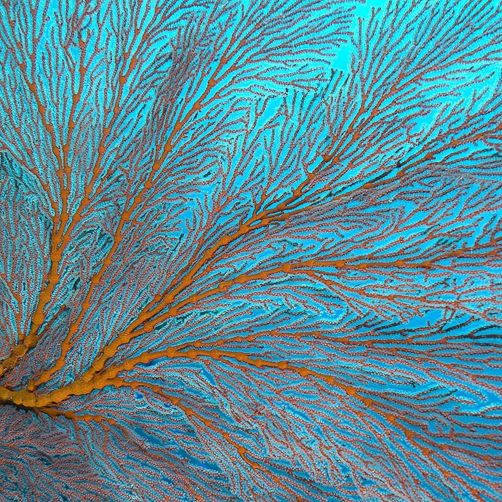An astounding form of coral are the majestic gorgonian sea fans. These amazing constructions are made up of tiny creatures which form a colony. Some, like this one, are over three metres wide. They exist jutting out from the reef such that their massive surface area is at right angles to the ocean currents, enabling them to feed on plankton as it passes along the reef. Found across the top of Australia including Ningaloo Reef, Rowley Shoals and out to Christmas Island and Cocos Keeling Islands.