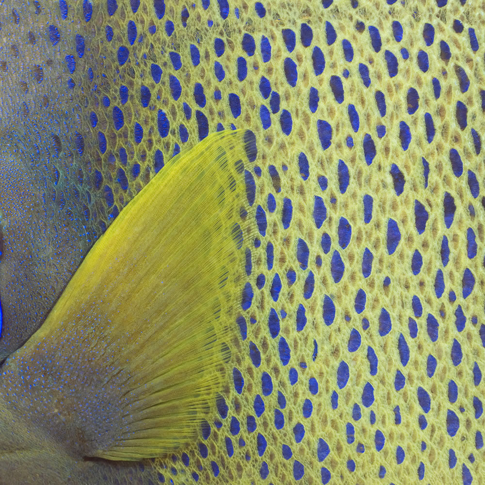 This little angelfish calmly allowed me to follow it along the reef as it stopped here and there to be groomed by eager cleaner fish and shrimp. Fish have no facial expressions but this little one had a look of absolute bliss as the cleaner fish and shrimp attended to its scales and even inside its gills and mouth. Commonly referred to as semi-circled angelfish, they are found in most tropical seas of the world. This one was photographed at Ningaloo Reef. I have named the image after the first part of its scientific name "holocanthus".