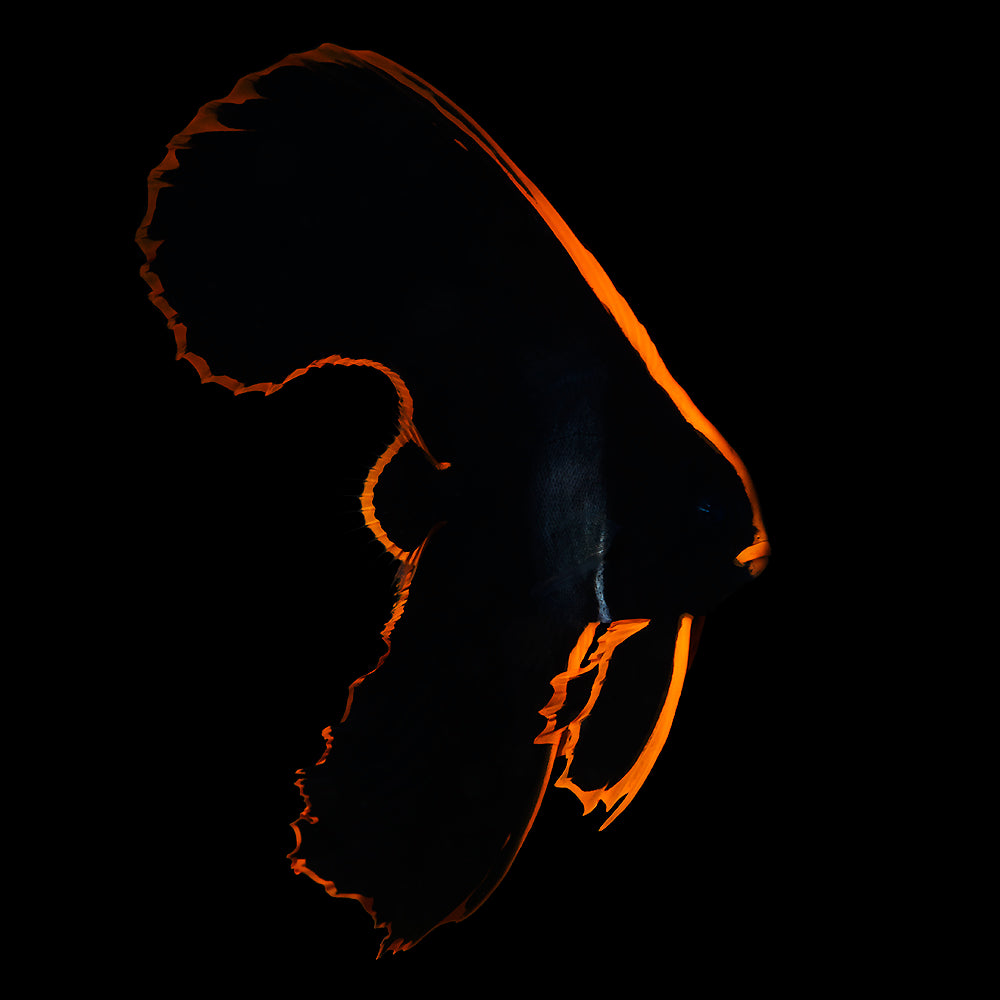 “Neo or New.” One of my most desired of subjects, these small young batfish are jet-black with a bright orange fringe and as they grow, their dorsal and bottom fins elongate to create a most amazing looking fish. Photographed against a dark background and exposing purely for the bright orange creates a mesmerising silhouette. Then as they first begin to morph into an adult a light vertical stripe begins to appear on the body, which eventually becomes mostly grey and at the same time loosing the orange altogether. This one was just at the early stage of its colour change from black. Found across the top of Australia and on all coral reefs in the Indo/Pacific region.