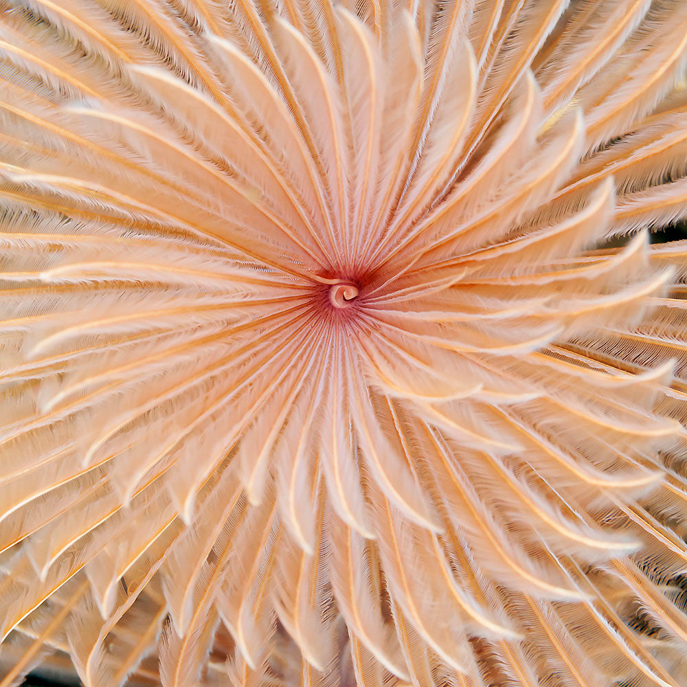 Sabella are a species of filter feeders that live on the sea bed and among coral reefs. The spiral pattern created by the filter feeding fronds of these creatures is a classic example of mathematics defining the beauty within nature. This spiral can be explained as a sequence of Fibonacci numbers that create an ever expanding ratio often referred to as the golden ratio, it is the most recurring ratio within nature everywhere and is considered the most pleasing ratio to the human eye. Photographing these tiny wonders that are about 3-4 centimeters across is challenging as once they sense the flash from your camera they withdraw quicker than the blink of an eye. Photographed at the top of Exmouth Gulf, near Ningaloo Reef in Western Australia.