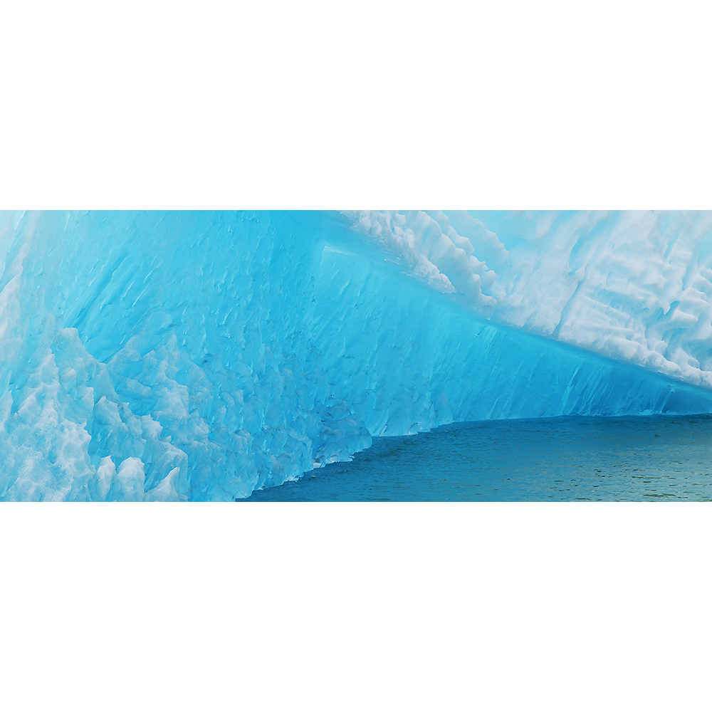 Icebergs in the sea are continuously evolving, almost as if they are alive. One moment they can be static and still only to suddenly split apart or roll over and form a completely new shape. Here I am looking down deep under what was once the lip of the berg that floated on the surface, underneath that lip it eroded away until with a new centre of gravity it rolled exposing this incredible angular composition. Snow falls onto high mountain peaks and over millennia it compresses down and down into deep massive glaciers that slowly grind towards the ocean. At the face of these glaciers massive sections of ice “calve off” in dramatically loud shudders that crash into the sea. The incredible blue is the snow so compressed when it forms into ice that all air has been squeezed out. The small black dots are small stones and objects that were embedded deep within the ice thousands of years ago.