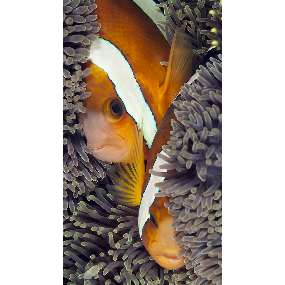 Like two close friends, these Clark's anemonefish snuggle down into the safety of their anemone as I close in to take the photograph. Anemones have stinging cells in their tentacles which would kill any predator but the anemonefish are immune to the stings. In turn the anemonefish clean and sometimes even feed the anemone which creates a perfect symbiotic relationship where they both benefit. Clark’s anemonefish are found in Ningaloo Reef and the Rowley Shoals off Western Australia as well as in the tropical waters of the Indo/Pacific.