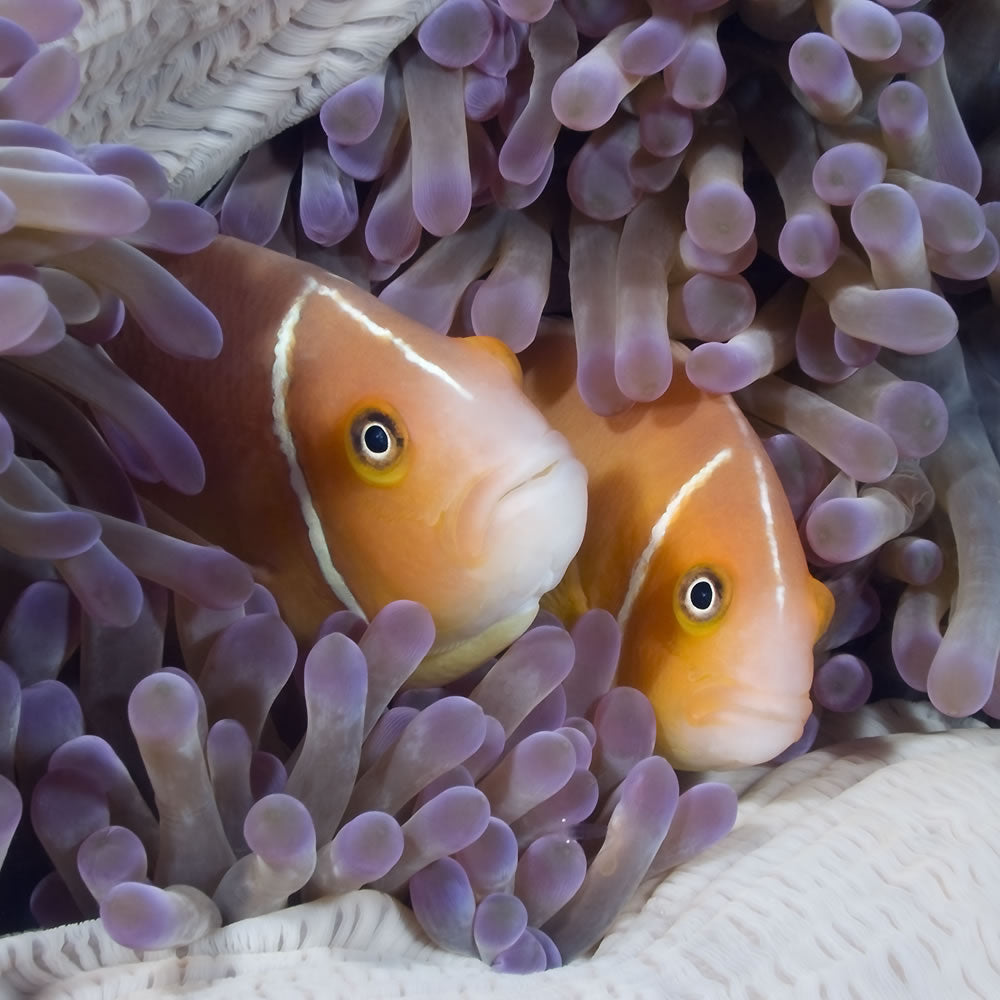 Pink anemonefish are colourful creatures both in character and appearance. These two were flittering about the anemone until I arrived, then they teamed up to give each other courage. They would swim through the tentacles and together poke out to look at me. The anemone itself was extraordinary in colour with an intricately patterned mantle. Look closely and you will also see the tiny white eyes of small transparent shrimp. Anemonefish are found in most tropical oceans and right across the top of Australia including Ningaloo Reef, Rowley Shoals and Christmas and Cocos.