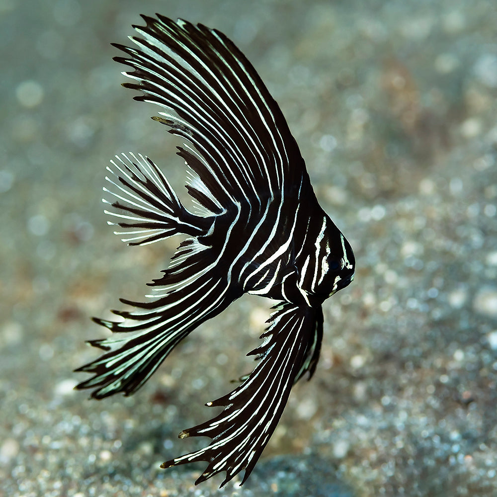 This juvenile “Batavia Batfish” was an absolutely stunning and rare find. Tiny at around 3cm tall this little fish hovered near a small soft coral at around 28m in depth. We found it at exactly the same location over several dives, so it would appear it would stay within the protection of the coral until it out-grew its size. It would probably then seek out another protective location until it eventually grew into a large adult, which incidentally is a relatively patternless dull grey fish. I stayed with this fish for most of each dive and waited patiently for it to move away from the coral for just seconds at a time to feed, allowing me to isolate its beauty against the plain background of the seabed.