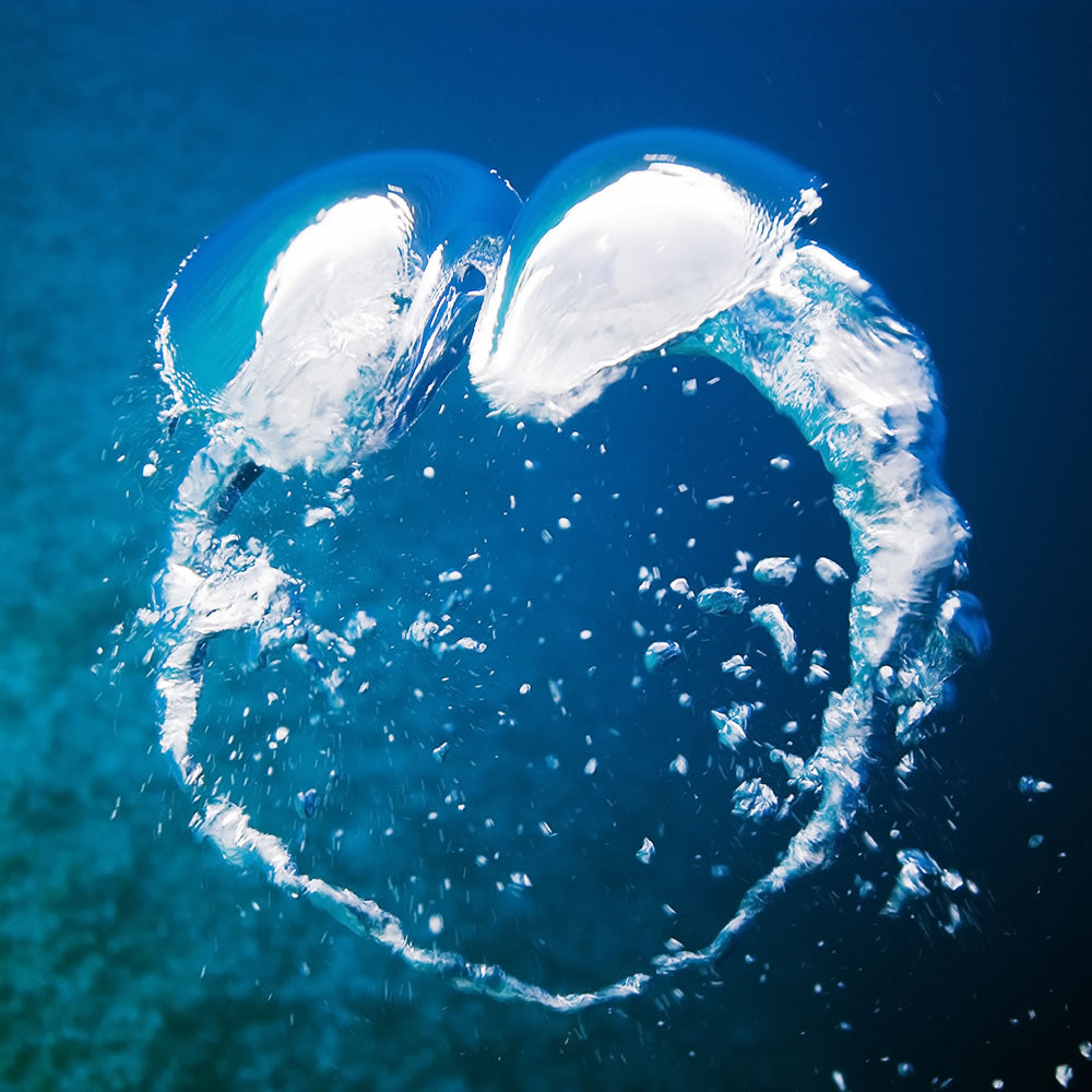 Resembling a vibration of mercury or, as it is often referred to, quicksilver, a diver’s bubble races to break the surface. After being exhaled, each bubble rises and in doing so it expands with the decreasing water pressure. The increasing surface area of the bubble conflicts with the surface tension of the water and, as they rise, most larger bubbles have a tendency to split into two. I had no idea that they formed this symmetrical shape at the split second of separation until after I saw the shot that I had taken.