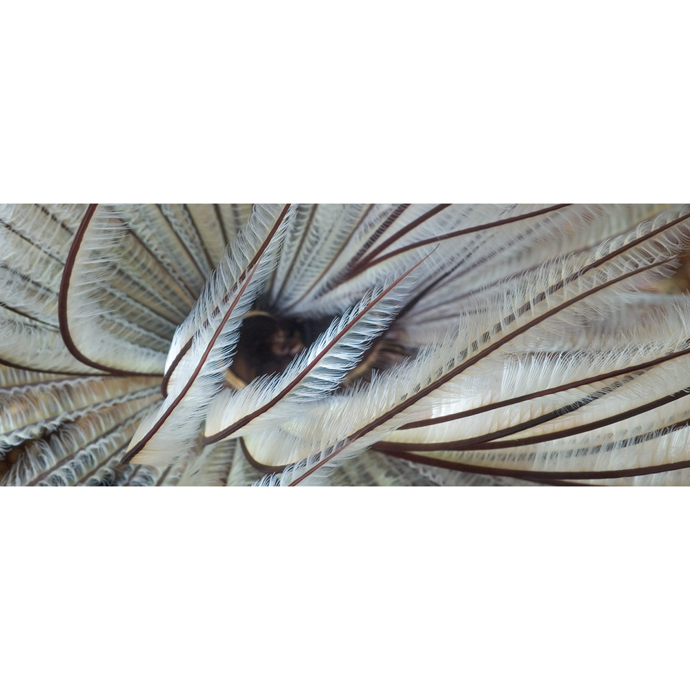 Feather worms or tube worms are incredibly delicate, so much so that they instantaneously withdraw into a protective tube at the slightest disturbance. This worm allowed me one photograph. After the flash went off, it was gone. I waited patiently for 10 minutes and although it did begin to re-emerge several times, the bubbles of my breathing disturbed it each time.
