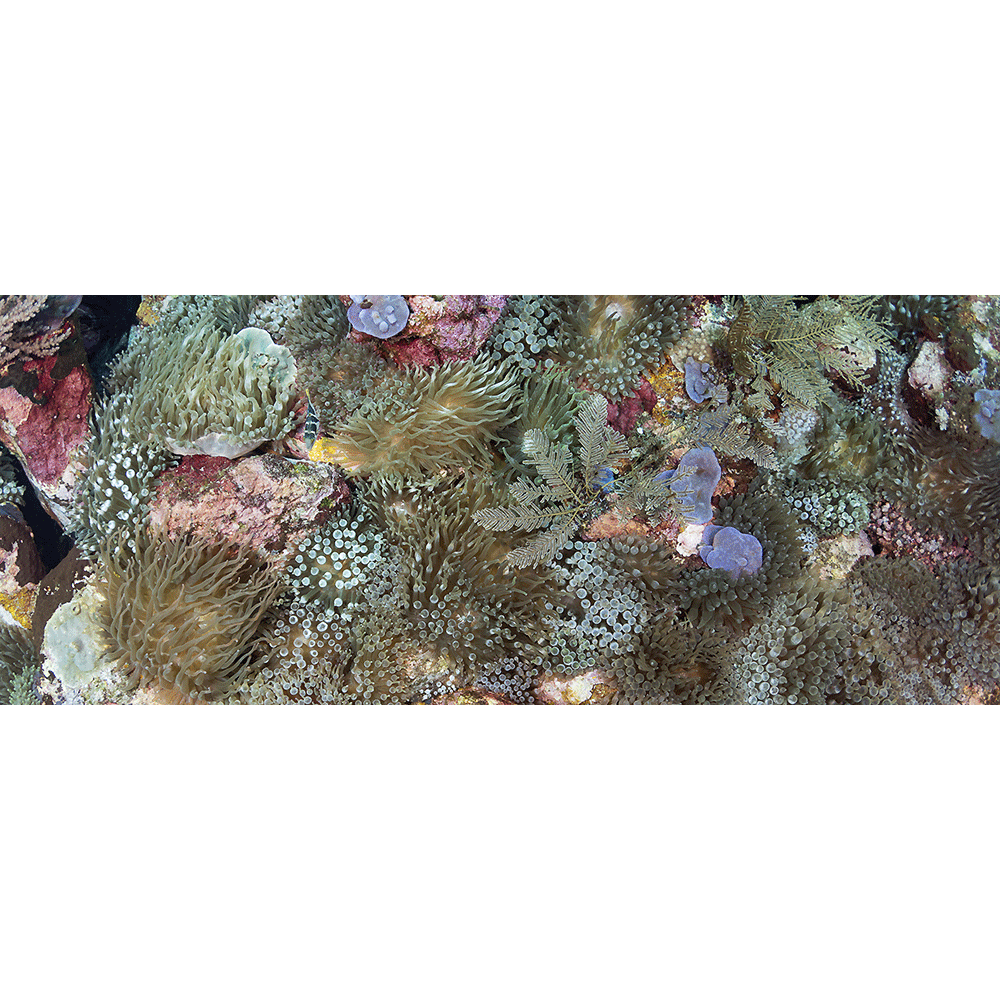 Imagine a reef slope of corals and colourful boulders covered in a stunning blanket of anemones, all so close together they literally touch each other. Alor, Eastern Indonesia above Timor is a region of oceanic deep water and narrow channels between several islands. Here very cold up-wellings bathe the reef slopes in thermoclines of (18-21 degC) water. This all translates into extremely healthy and very unique reefs of incredible density. I was so captivated with this reef slope that the only way I could do it photographic justice was to shoot straight down, capturing the chaotic patterns and textures of the rocks and reef growth, which in itself was simply beautiful.