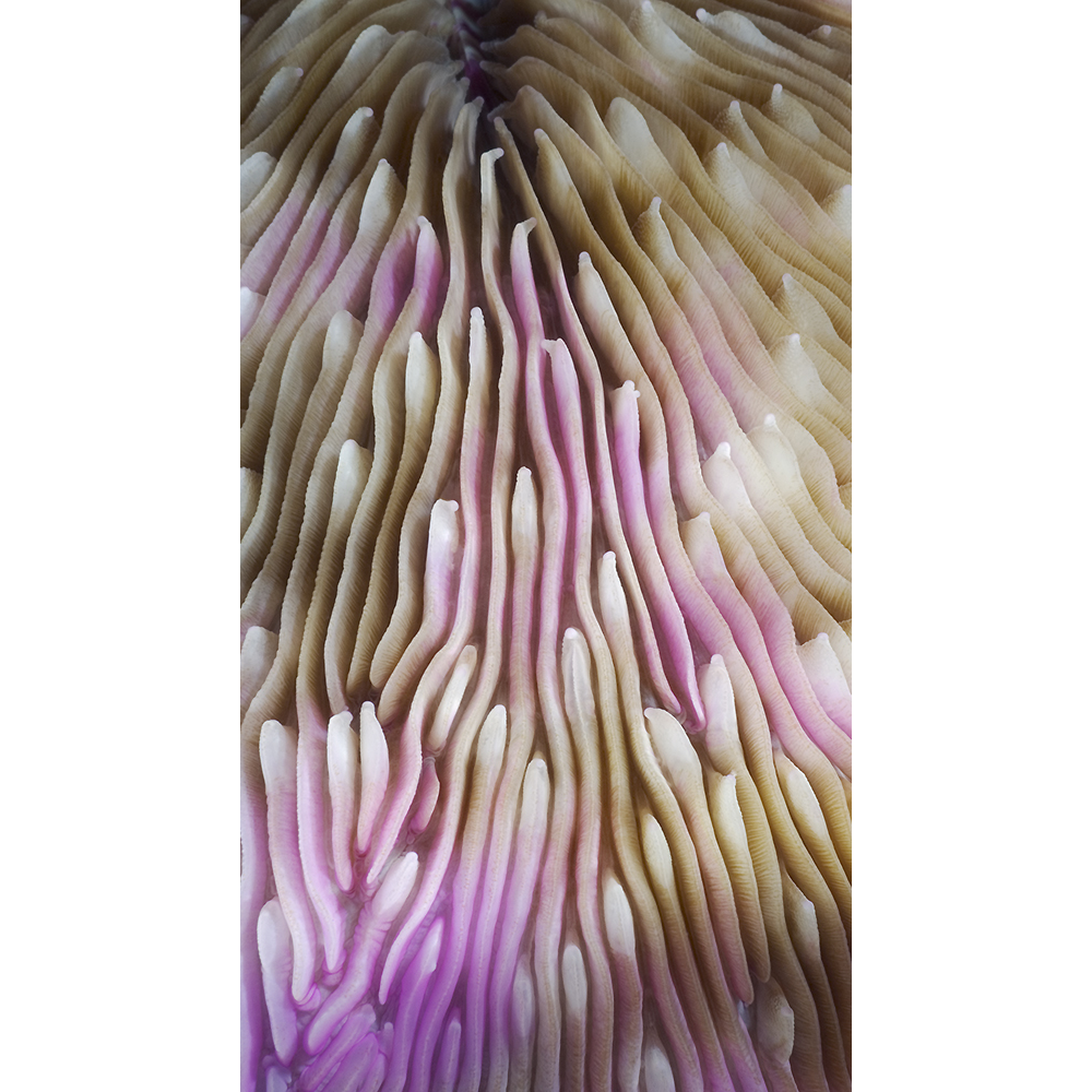 Fungia corals like this one are found on most coral reefs throughout the world. A hard coral with a central mouth, this subject was photographed at Ningaloo Reef in Western Australia. Radial fins in the coral converge on the central mouth and where most Fungia corals are bland in colouration this subject had incredible pinks blotched over its hard ridged surface where all the ridges converge towards its central mouth.