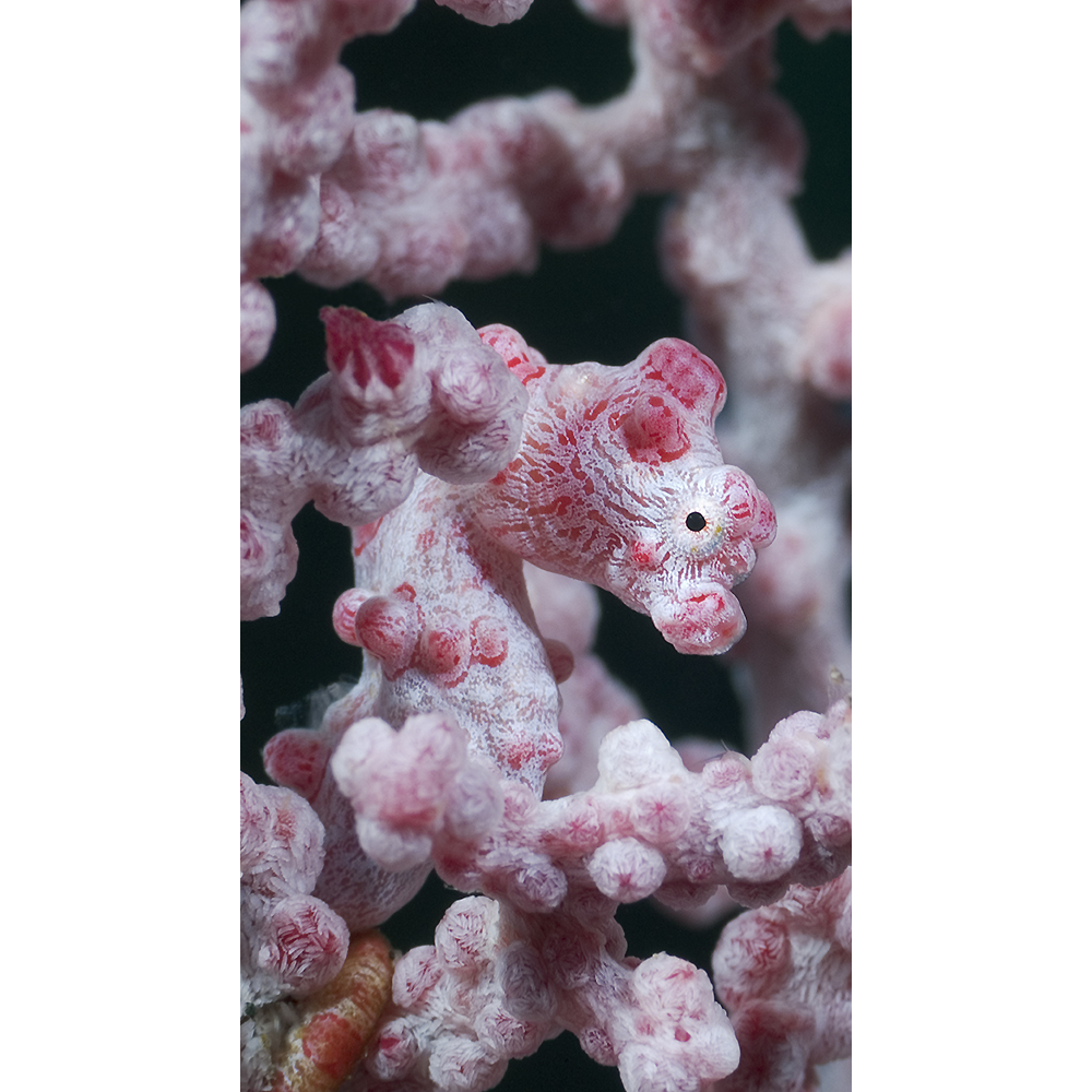 No bigger than 10mm high, these minuscule pygmy seahorses almost exactly match the colour and texture of the corals they live upon. It can take most of a dive just to examine the entire gorgonian coral and then be completely disappointed by not finding one. I photographed this one northeast of Bali and I remember that the coral it was hiding on was vibrating because the current was so strong.