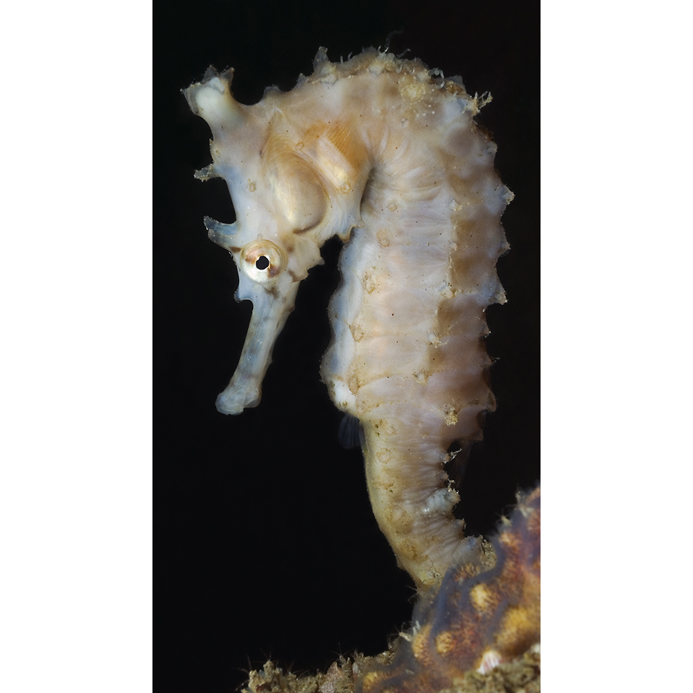 This tiny juvenile seahorse (70mm high) was sheltering amongst the mooring lines of boats that use the Swan River near Bicton. It apparently felt quite safe between two ropes, one of which you can see covered in growth in the right bottom corner of the print. I was able to carefully angle my underwater flash to allow me to light it clearly without disturbing it into hiding.