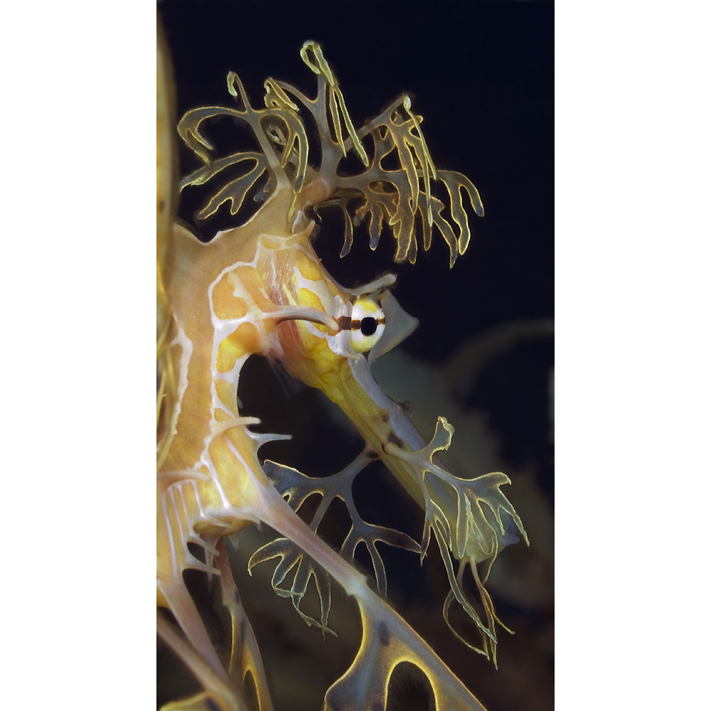 I settled in front of the reef and stayed very still watching the dragon. As the surge from the swell swept over the reef the dragon was moved gently to and fro, at times coming very close to my lens. This shot was taken as it turned away from me. I am shooting along its body and it is almost as if it was looking back at me over its shoulder.