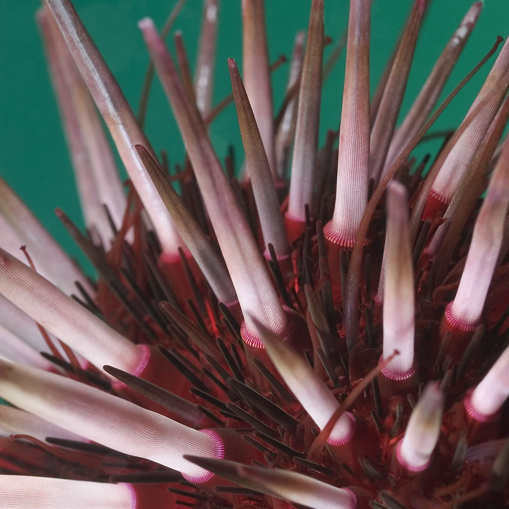 Sea urchins are from the species group echinoderms and this one, a cool water species found in the southern seas of Western Australia, is common around reefs and jetties. They can be easily seen as they wander around at night. Diving at Rob Jetty in Cockburn Sound I found many of these creatures still out and about one morning, probably due to the low light level created by the silty green water. Revealed by my camera lens, their complexity is far greater than could be seen with the naked eye.